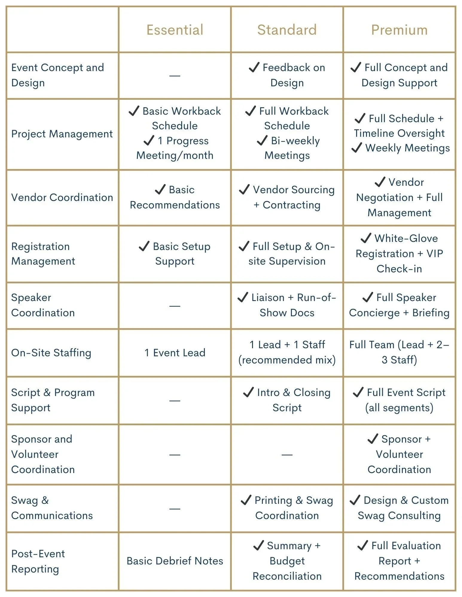 Event Planning Event Planning Clear Filters Filter Clear Filter Timelines and Run of Shows Organize and advise on external and internal programs with step-by-step tasks, drafting scripts, coordinating speakers On-Site Event Management On-site management of logistics, vendors, volunteers, speakers, VIPs photographers, and day of set-up and tear-down. Post-Event Follow-Up Feedback on lessons learned and identify areas for improvement Venue Sourcing, Vendor Management, and Event Design Selecting venues, securing contracts, permits, sourcing, quotes, working with vendors, audio visual, décor, and branding Budgeting and Financial Management Managing detailed budgets, tracking expenses without compromising quality, finding cost-saving opportunities Event Concept and Strategy Development Understanding the goals of the event, aligning the event concept, identifying the audience, and delivering on sponsorship promises No results found No results match your search. Try removing a few filters.